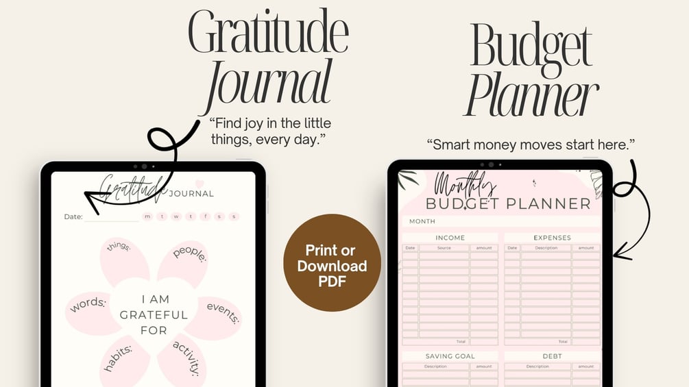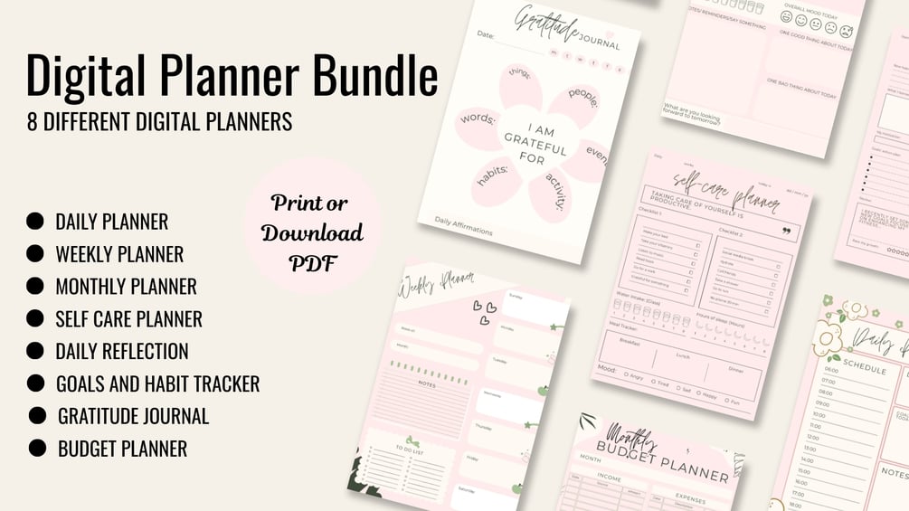 Daily Planner, Weekly Planner, Monthly Planner, Self-Care Planner, Daily Reflection Journal, Goals & Habits Tracker, Gratitude Journal, and Budget Planner